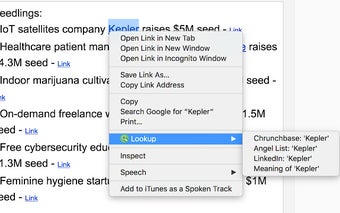 Lookup est un module complémentaire gratuit pour Chrome développé par Dhananjay Nakrani. Cet outil améliore l'efficacité de la navigation en ajoutant des termes de recherche fréquemment utilisés au menu contextuel. En cliquant simplement avec le bouton droit, les utilisateurs peuvent accéder à des requêtes de recherche prédéfinies telles que 'XYZ crunchbase' ou 'ABC Angel List'. Cette fonctionnalité rationalise le processus de recherche et fait gagner du temps aux utilisateurs qui recherchent fréquemment des termes spécifiques en ligne.
